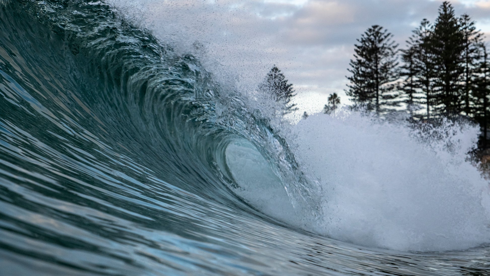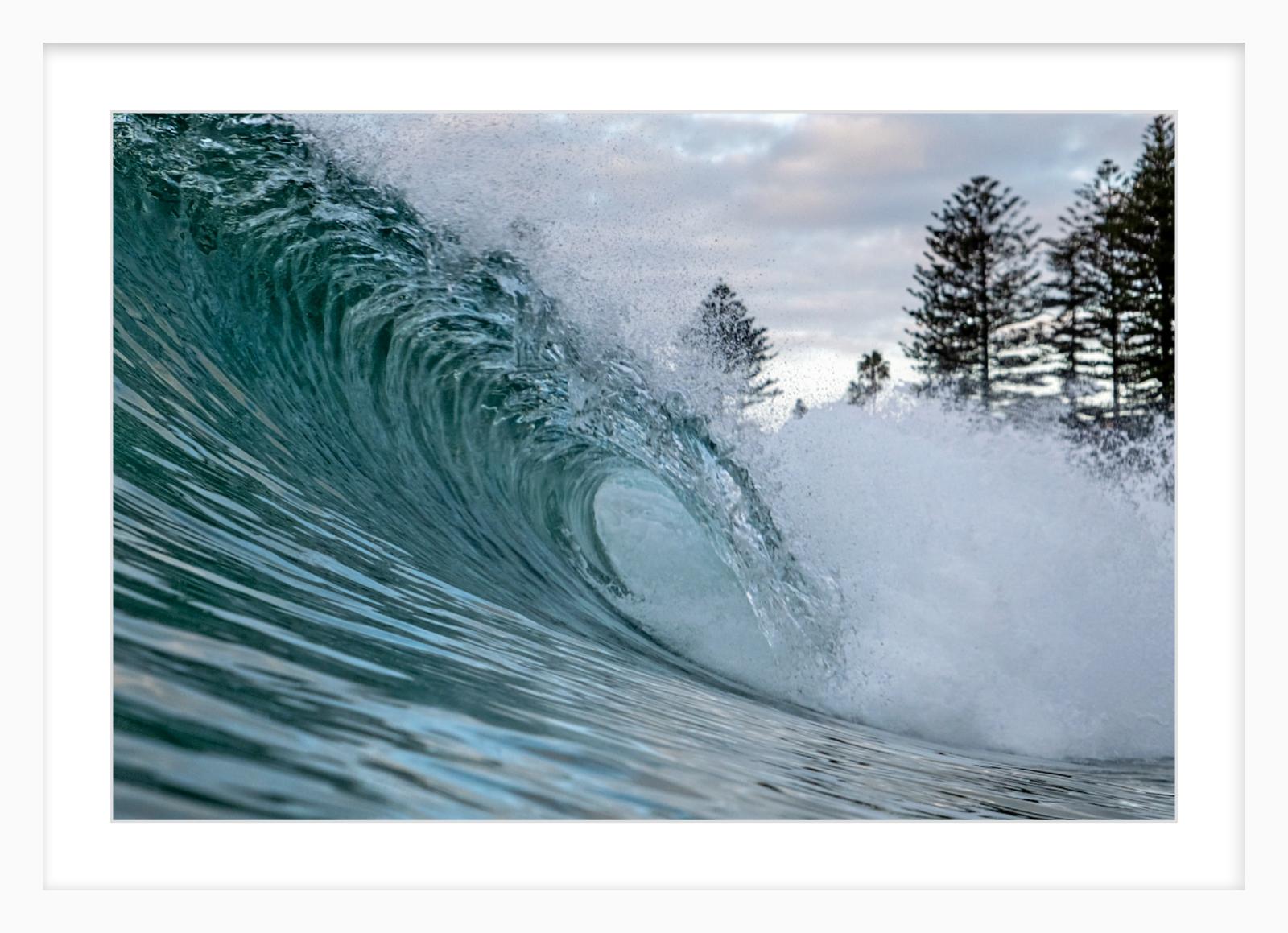 In the background, iconic Norfolk pines rise with quiet authority, their silhouettes grounding the scene in a distinctly Australian sense of place. The contrast between the calm, steady forms of the pines and the dynamic movement of the breaking wave creates a harmonious tension—nature’s serenity meeting its raw power.