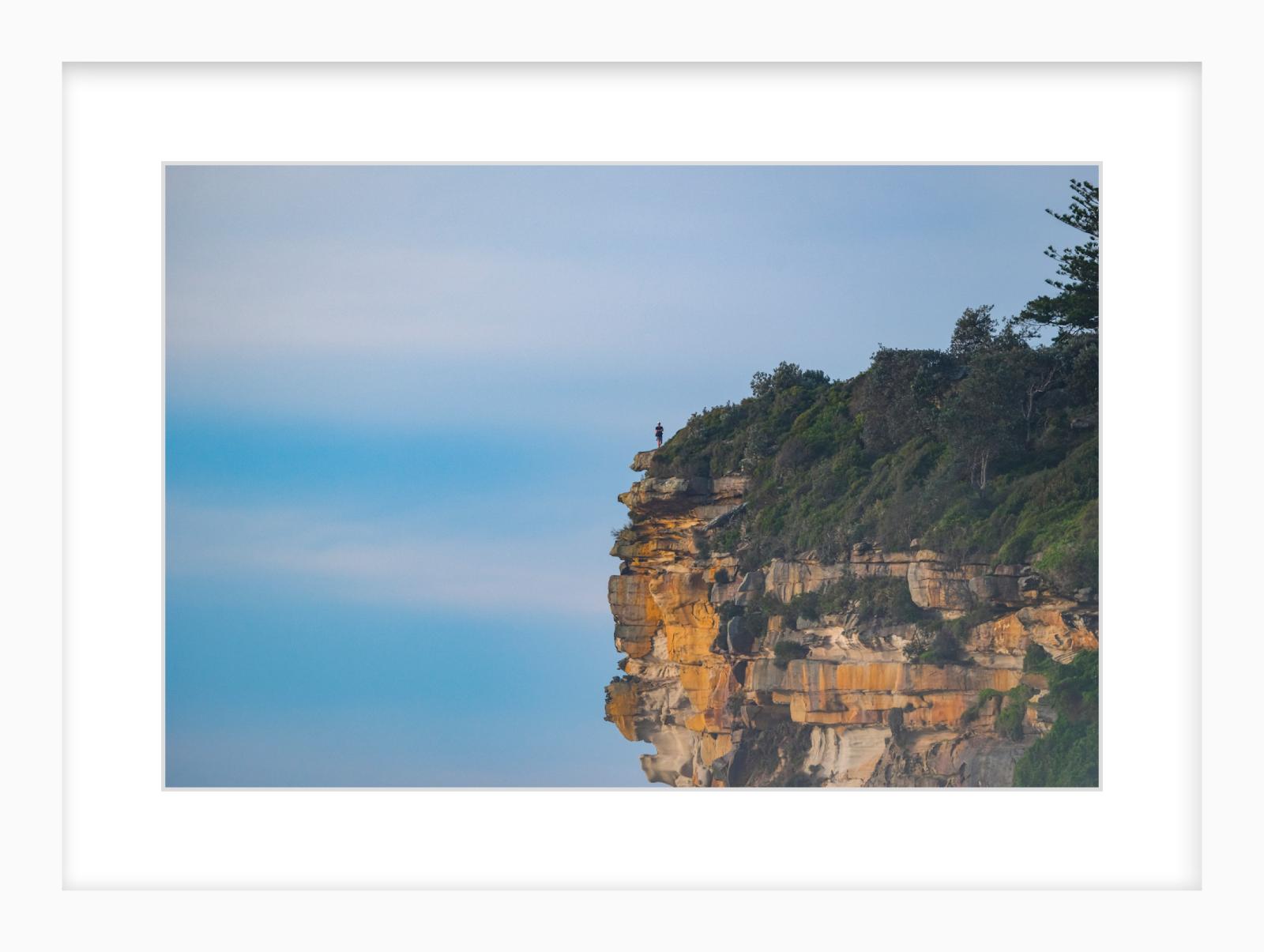 This framed print captures the raw solitude of Sydney’s Northern Beaches: towering geology, soft morning light, and the simple stillness of being small in a vast and beautiful place. A perfect piece for anyone who feels at home where the land meets the sea.