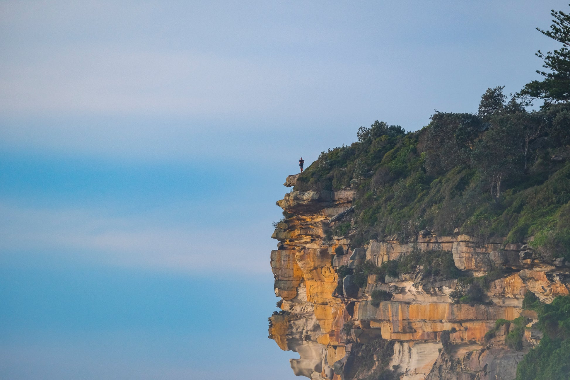 Between North Curl Curl Headland and Dee Why Point rises a pre-historic sandstone cliff — a weathered giant carved by wind, salt, and time itself. In this moment, a lone figure stands before it, gazing out over the calm sweep of the bay. The world falls silent. Just you, the ocean, and the weight of deep time.