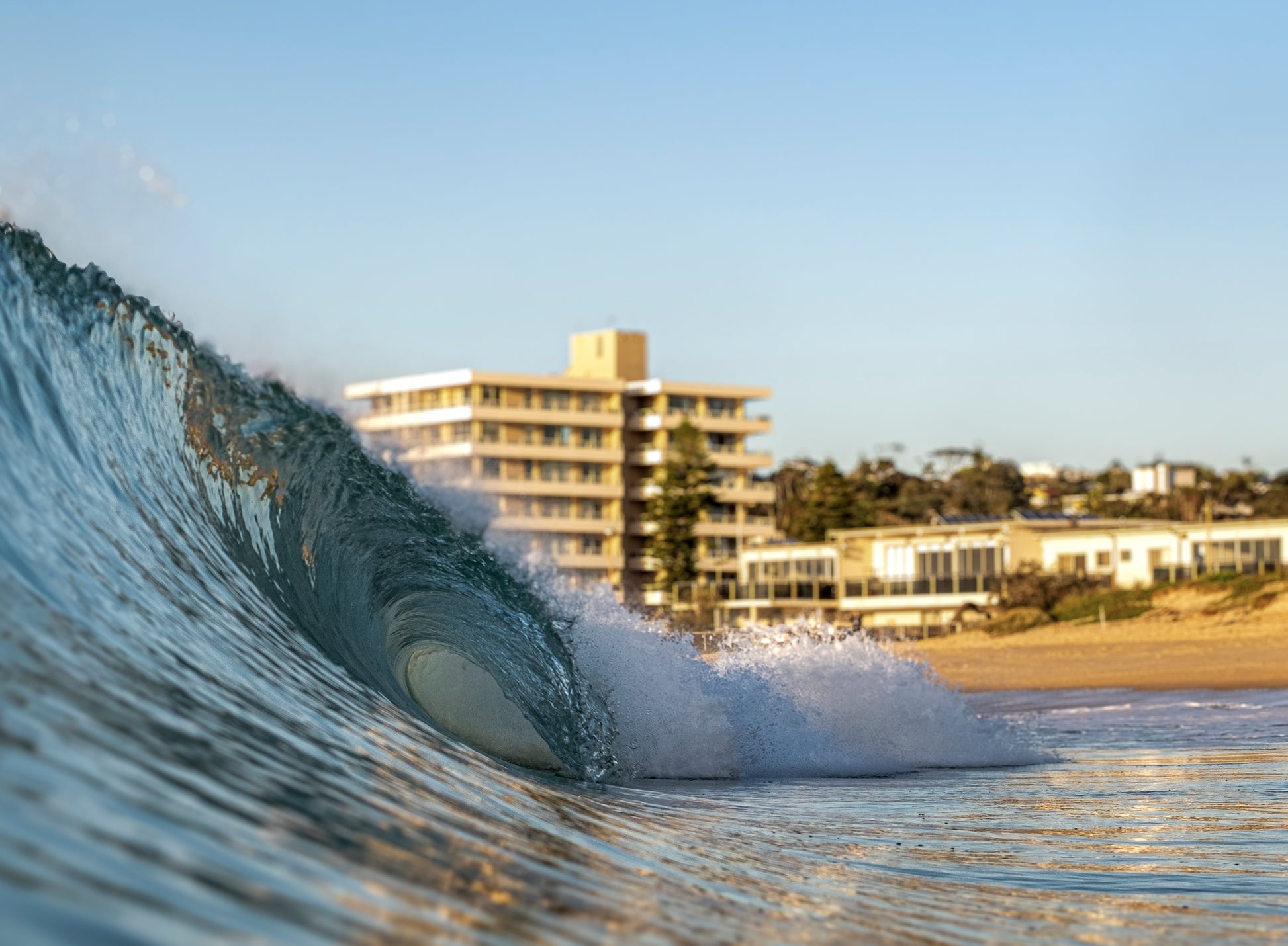 A surfer’s dream captured in one perfect moment — the first light of summer spilling across the shoreline, golden glare bouncing off the buildings, and the ocean alive with waves about to break. Pure anticipation, pure energy, pure Australia.